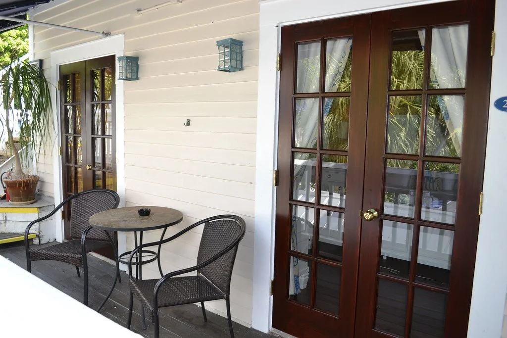 Room 29, (double occupancy only) approx 300 square feet, is located on the 2nd floor tucked away in a quiet corner of the property. Decorated in shades of rich tangerine, custom blue octopus pattern fabrics whitewashed furnishings that gives this room an ocean-side bungalow vibe. Room 29 has easy access to the 2nd level deck for morning sunbathing and an afternoon shaded lounge area.