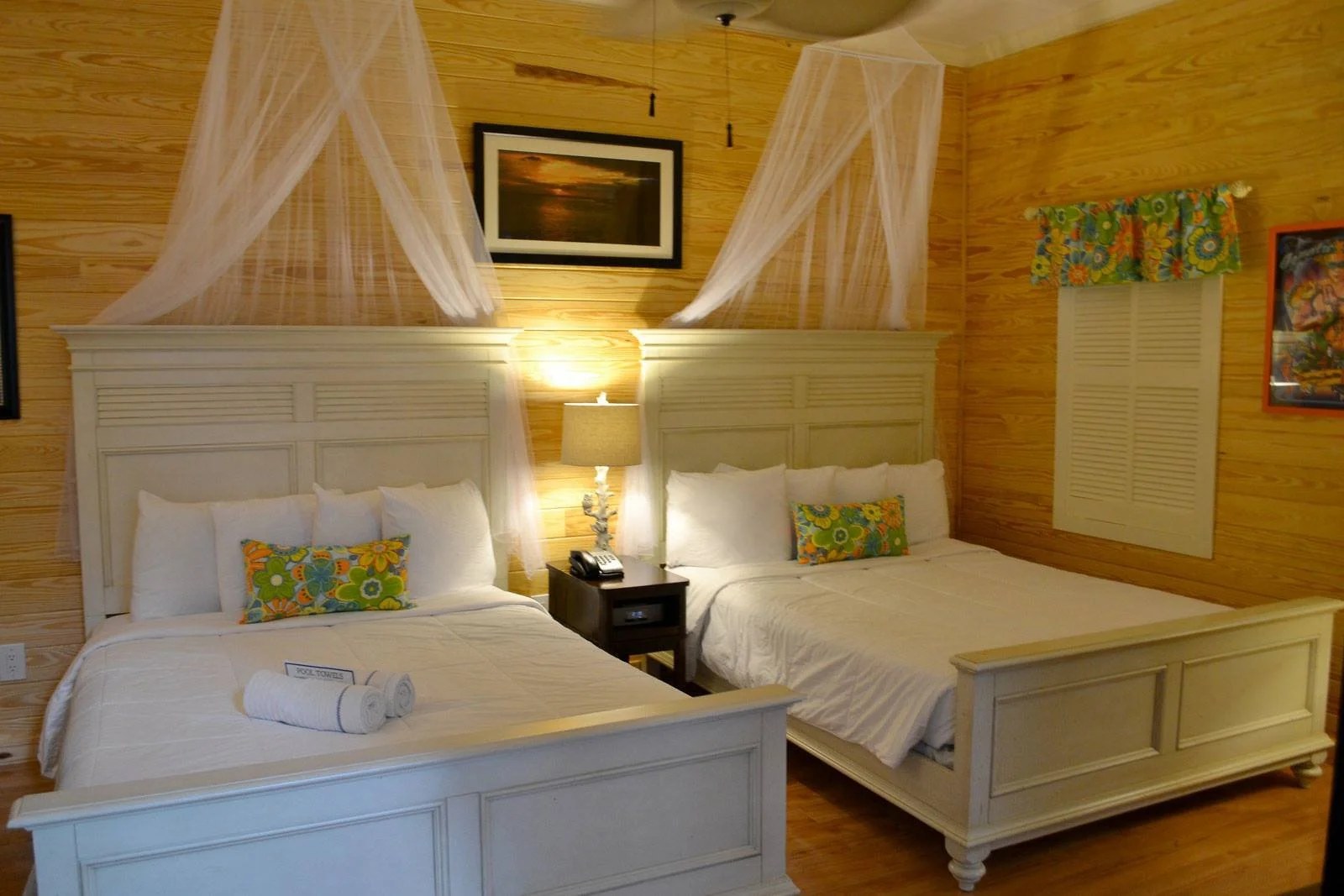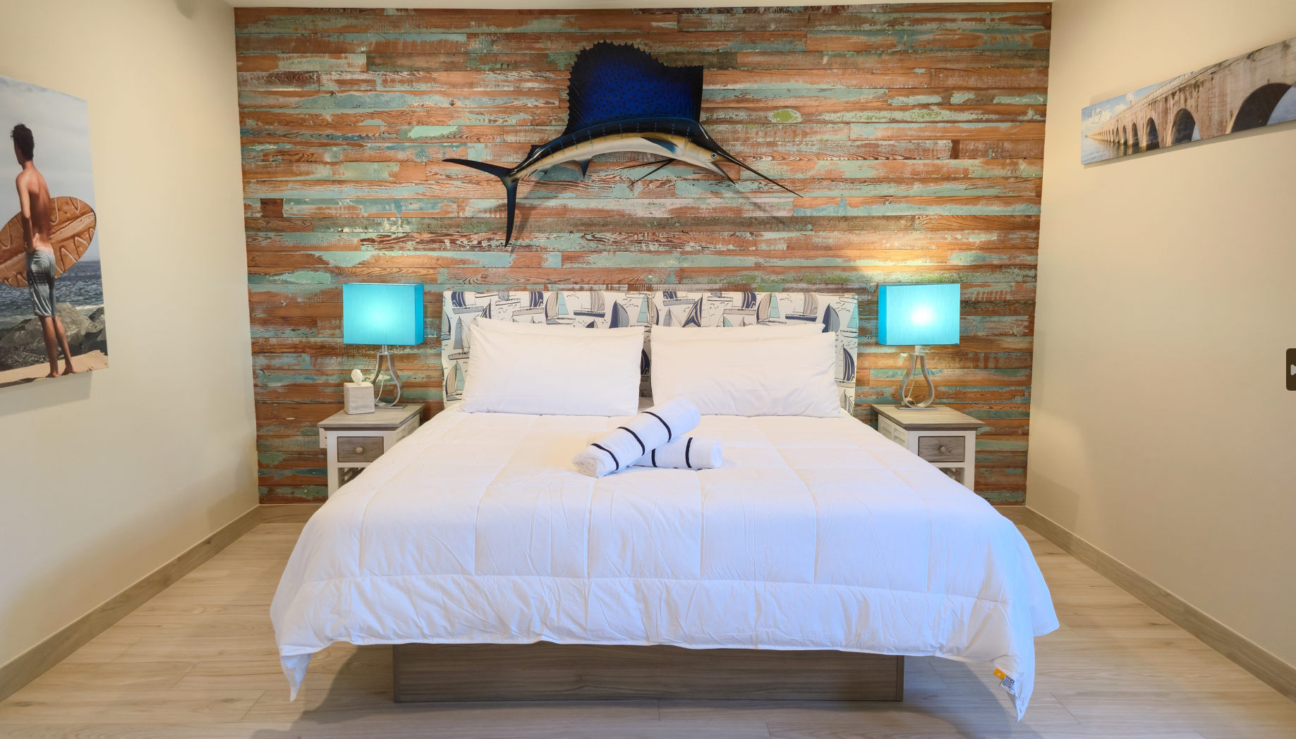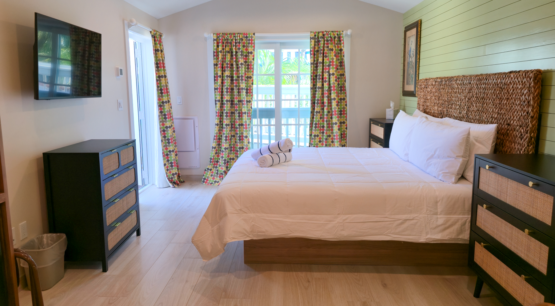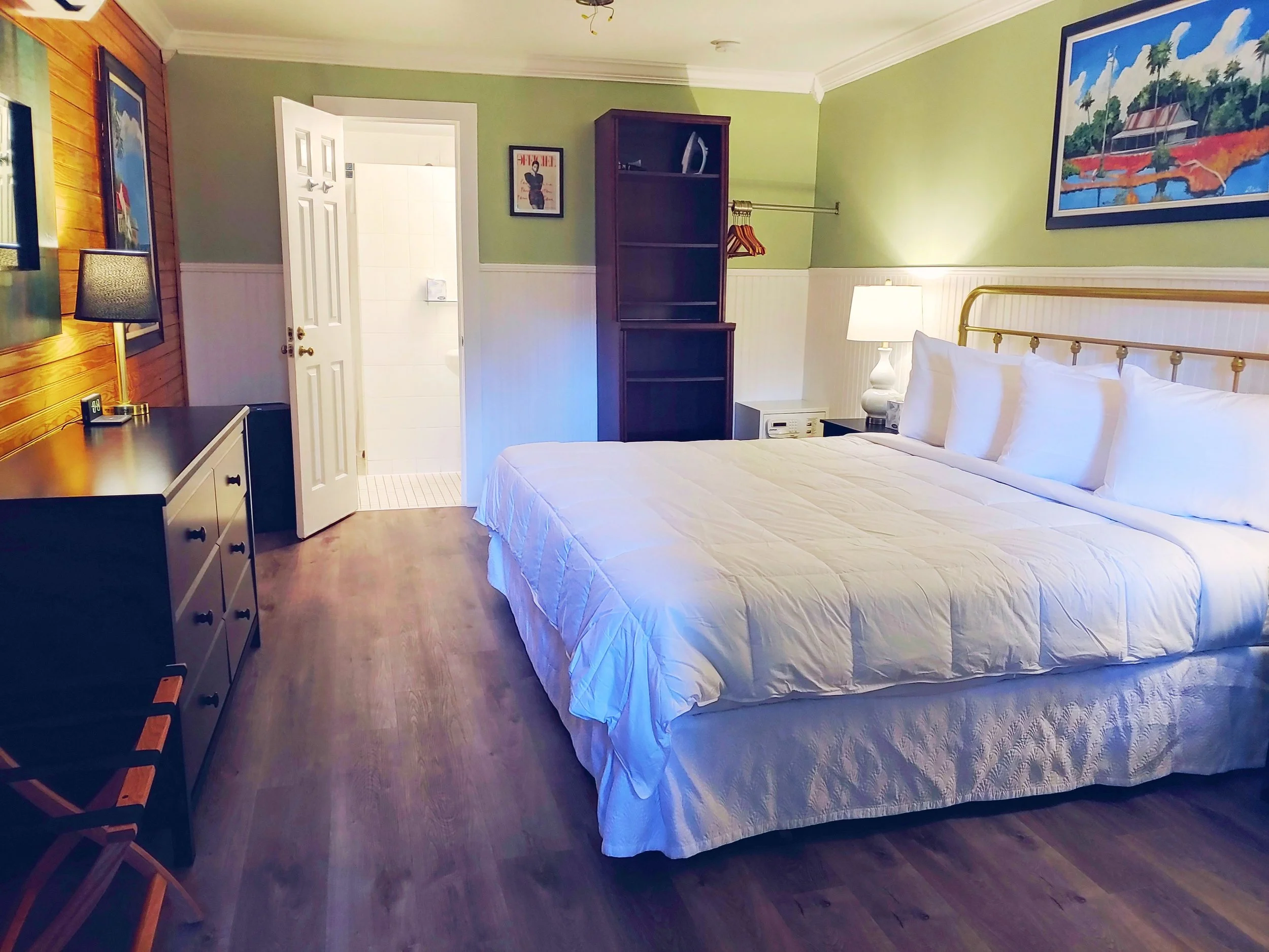 Cabana King Room 41 is located on the 1st floor at the quiet rear of the property in a Tropical oasis just steps away from our poolside deck. The ocean is brought to you with wooden hand-carved sea life art.