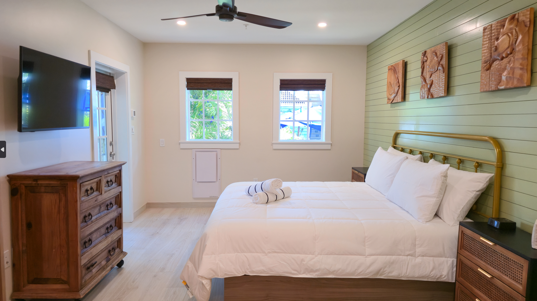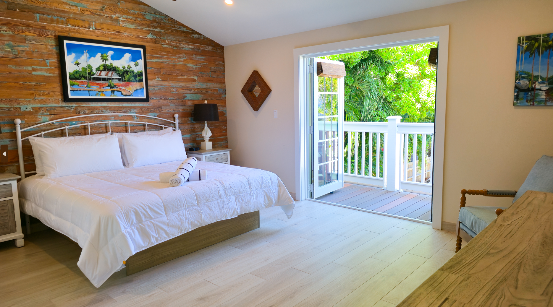 Cabana King Room 40 is located on the 1st floor at the quiet rear of the property with French doors opening to a Private Veranda. Across the 7-mile bridge, this room brings you into the Key West vibe of beach & boating. ADA accessible with extra wide bathroom entrance. ADA accessible with extra wide bathroom entrance.